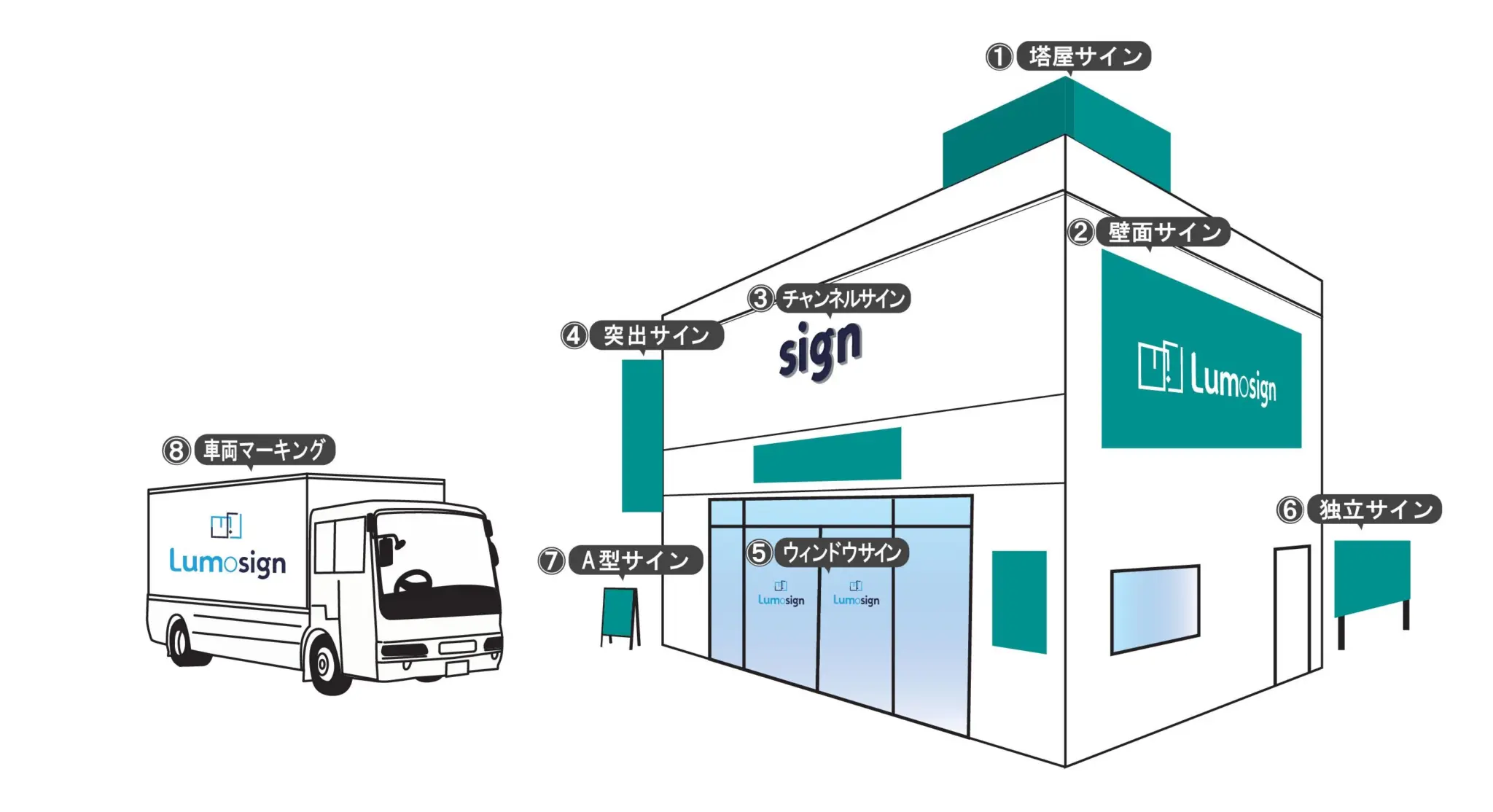 看板の種類によって、設置場所や目的に応じた効果が異なります。Lumosignでは、お客様のニーズに合わせて最適な看板をご提案し、企画・デザインから施工・メンテナンスまでトータルサポートいたします。